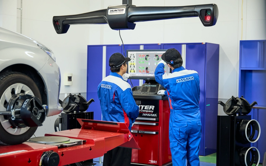 タイヤの向きや角度、位置関係を測定し、メーカーが定めた基準値内に収まっているかを確認する機器です。車両の直進安定性を保ち、タイヤの偏摩耗を防ぐほか、無駄な抵抗を減らすことで燃費の向上にも貢献します。